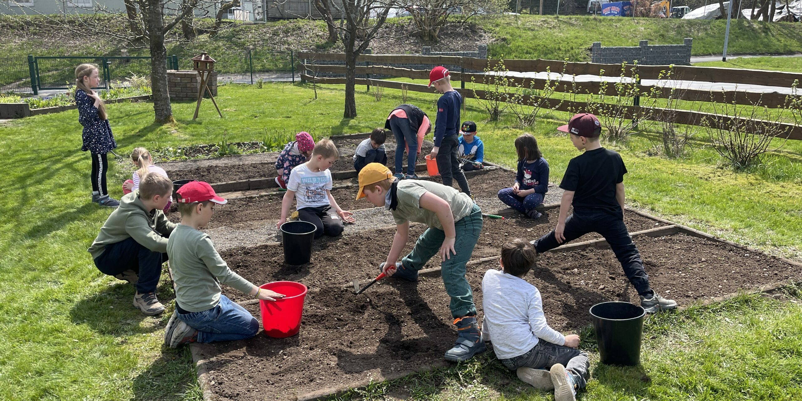 Unsere Zweitklässler bereiten derzeit ihre Schulgartenbeete für die neue Bepflanzung vor. Die Auflockerung der Erde sowie die Beseitigung von Unkraut war Schwerpunkt ihrer Arbeit. Zugleich festigten die Kinder ihr Wissen über die verschiedenen Arbeitsgeräte, die sich im Gerätehaus befinden. Nun dauert es nicht mehr lange, bis die Beete neue Samen erhalten werden. Was wohl dort wachsen wird? Seid gespannt.